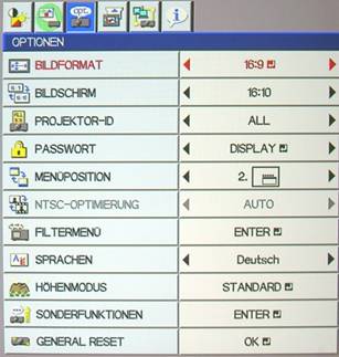 Anscheinend wollte man keinerlei Risiko eingehen und hat auch beim neuen UL7400U die herkömmliche Menüstruktur beibehalten, wie sie seit vielen Jahren in nahezu allen Mitsubishi-Projektoren zum Einsatz kommt. In fünf Hauptkategorien, horizontal durch Symbole gekennzeichnet und nach Themen sortiert, befinden sich alle Einstelloptionen.