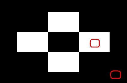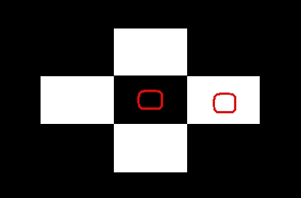 Wie bereits erwähnt erreicht der LCOS Projektor "nur" 250:1. Tatsächlich, auch mit dem Auge kann man erkennen, dass das Schachbrett hier nicht so plastisch aussieht, wie bei dem DLP-Beamer mit mehr ANSI (500:1). Der höher On / Off Kontrast kann dem LCOS Beamer nicht helfen, warum? Das schwarze Messfeld in der Mitte ist von gleich vier weißen Feldern umringt. Es handelt sich hierbei also um einen besonders ausgeprägten Fall von Hell / Dunkel Übergängen. Durch den "Schweif" der LCOS-Technik erzeugen die vier weißen Felder um sich herum Streulicht, das in das schwarze Feld hineinleuchtet, der Schwarzwert und damit ANSI-Kontrast verringert sich. Doch wenn unserer Theorie stimmt, dann hängt das Ergebnis nur von den Feldern in direkter Nachbarschaft ab, der restliche Bildinhalt ist für den Kontrast egal. Um dies zu überprüfen haben wir alle weiteren weißen Felder aus dem Bild gelöscht und lediglich die vier weißen Felder in der Nachbarschaft belassen.