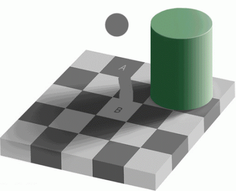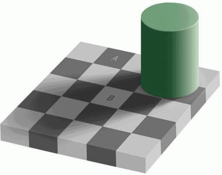 Bei aktuellen Kinoprojektoren liegt der gemessene Kontrast in diesem Testbild zwischen 250:1 und 600:1, je nach Projektionstechnik. Dies sind im Vergleich zum On / Off Kontrast überraschend geringe Werte, doch ist dies tatsächlich so tragisch? Nein, denn: Bei hellen Bildern ist ein tiefer Schwarzwert recht uninteressant, da das menschliche Auge hier auch hohes Restlicht in dunklen Bildbereichen (Person im Sonnenlicht mit schwarzer Jeans) als tiefes schwarz "adaptiert", dazu ein Beispiel, wie schnell sich das Auge täuschen lässt in Bezug auf die wirkliche Helligkeit einer Bildpartie. So kann man sich gut vorstellen, dass bei unterschiedlichen Szenen ein und derselbe Schwarzpegel einmal schwarz und einmal grau aussehen kann: Feld "A" im hellen Bereich des Bildes wirkt deutlich dunkler als Feld "B" im Schatten der Säule. Doch tatsächlich haben die beiden grauen Felder (A/B) genau die gleiche Helligkeit, die selbe Farbe, es sieht nur so aus als sei Feld A viel dunkler als Feld B. Hier der Beweis: