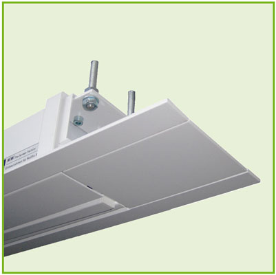 Farbe (weiß, RAL 9003) und Form passen sich gut an die herkömmlichen Deckenfarben an. Und sogar eine Wandmontage ist möglich, denn die in Profilschienen eingehängten Winkel können auch von hinten an dem Kasten montiert werden.