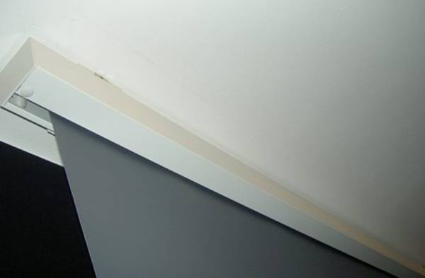 Nach der Montage verbleibt die Verkabelung, denn es handelt sich um eine voll motorisierte Leinwand. Ca. 3m Kabel sind aus dem Rollkasten ab Werk herausgeführt (rechts oben), wer längere Wege zurücklegen muss, kommt um eine Verlängerung nicht herum. Bei den passenden Schaltern hat man die freie Auswahl, auch Unterputzschalter für besonders elegante Installationen sind kein Problem.