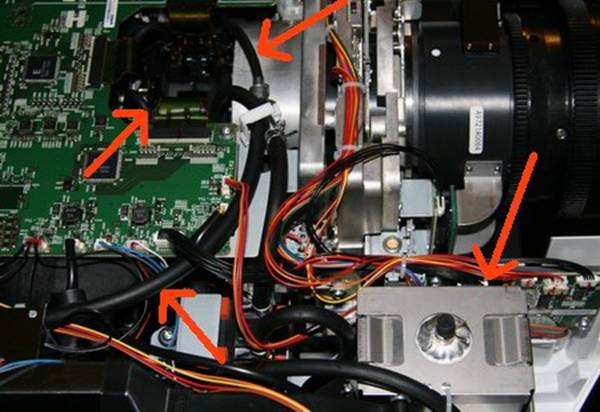 Die LCDs sind in kleine Kühlrahmen eingefasst, die mit Kühlflüssigkeit durchströmt werden und so die gefährliche Wärme vom LCD wegtransportieren. Wir wünschten, ein so effektives System würde endlich auch in herkömmliche Kinoprojektoren eingebaut, die Straubprobleme würden minimiert. Der Blick ins Innere hat auch gezeigt, wie die 5000:1 Kontrast in den technischen Daten möglich wurden: Eine adaptive Blende, soll die Angabe marketingwirksam nach oben schnellen lassen, ob sie aber auch so effektiv wie in einem Kinobeamer arbeitet, bleibt abzuwarten.