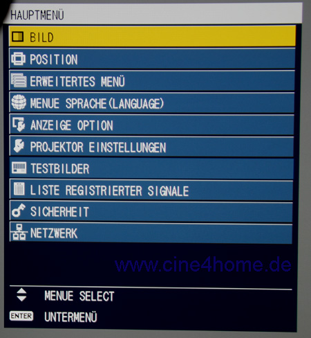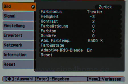 Nach dem Einschalten aktivieren wir die Bildmenüs und werden überrascht: Das Bildmenü des Epson kommt uns zwar bekannt vor, aber nicht von den aktuellen Kinogeräten à la TW5500, sondern eher von der Einstiegsklasse weit unter €1000.-