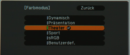 Ein Farbfilter schiebt sich nach dem Vorbild der Kinobeamer in den Lichtweg und bewirkt einen deutlich vergrößerten Farbraum, leider wesentlich größer, als die Videonorm voraussetzt. Und noch einen Nebeneffekt hat der Filter: Er kostet 70% Licht, gerade einmal 1800 Lumen verbleiben dem Epson Z8000. Unter 2000 Lumen? Das würden wir auch mit den klassischen LightPower Editions des TW3500/4400/5500 erreichen, der Theater-Modus ist also keine Option.