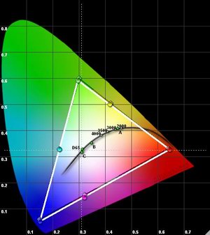 Schwierig sieht es bei der Farbtemperatur aus. Tatsächlich hat man nur einen RGB-Schieber für die Grundfarben. Auch hier ist uns letztendlich trotzdem eine gute Näherung an die D65-Norm gelungen, absolute Perfektion war aber nicht möglich.