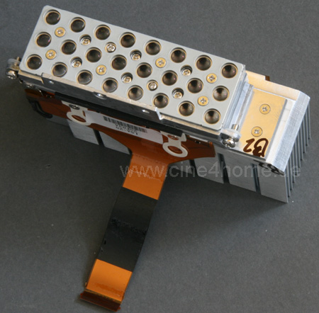 Unter der Platine sind wir schließlich am Ziel, hier kommt jetzt der gesamte Lichtweg zum Vorschein. Auffällig ist dabei der offene Teil zur Lichtbündelung, bevor der geschlossene DLP-typische Teil des Lichtweges beginnt.