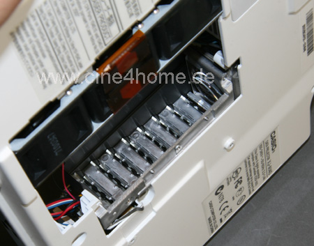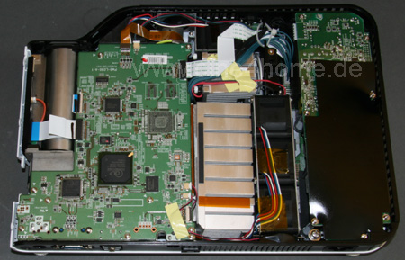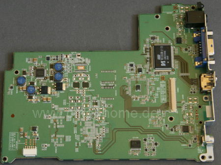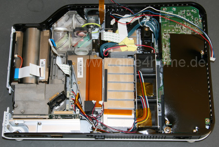Wir setzen unsere Untersuchungen fort und nehmen en Gehäusedeckel des Projektors ab. Im Inneren zeigt sich ein typischer Aufbau mit oben liegender Signalplatine.