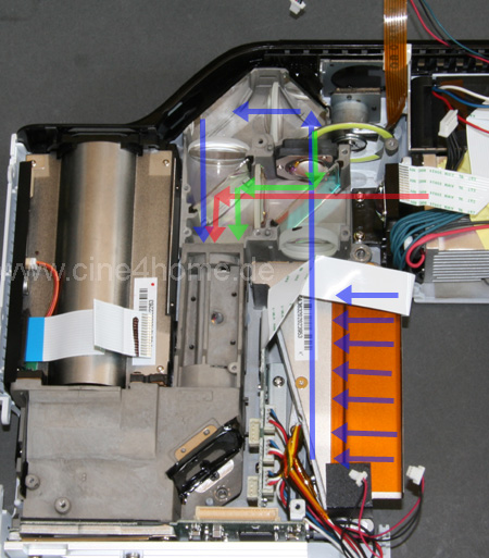 Wir beginnen mit dem roten Anteil, der von einer LED emittiert wird. Letztere befindet sich rechts im Bild und wird von einem Flachbandkabel verdeckt. Sie leuchtet geradewegs durch einen halbdurchlässigen Spiegel hindurch (langer roter Pfeil), bevor der Lichtstrahl durch einen halbdurchlässigen Spiegel nach unten in den verkapselten Lichtweg umgeleitet wird. Von hier wird es auf den DMD gelenkt, der die Helligkeitsanteile pixelbasierend moduliert, bevor es den Projektor durch die lange Optik verlässt.