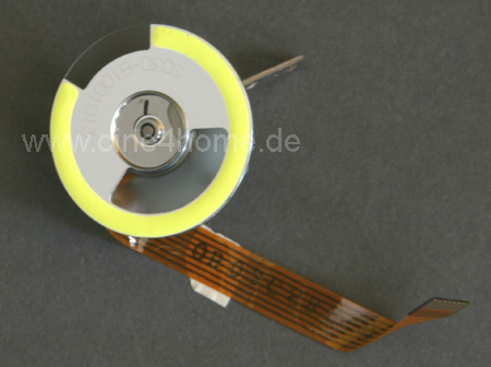 Komplizierter wird es bei den blauen bzw. grünen Spektralanteilen der Farbdarstellung. Um dies genauer zu erklären schauen wir uns erst einmal das dazugehörende „Farbrad“ an, das nur so groß wie eine 2Euro Münze ist. Statt aus herkömmlichen Farbsegmenten besteht es aus einer Aluminiumscheibe, die am Rand fast vollständig mit Phosphor beschichtet ist. Nur ein ganz kleiner Teil besteht aus einem transparenten Glasfenster.