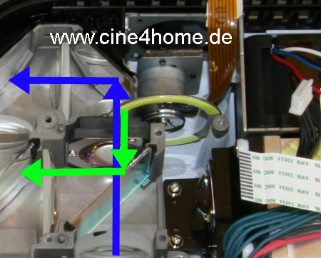 Damit das grüne Licht nicht zurück in die Lichtquelle strahlt, muss es von einem halbdurchlässigen Spiegel abgefangen werden. Dieser reflektiert es nach links weg (grüne Pfeile), wo es von einem weiteren Spiegel ebenfalls in den verkapselten Teil des Lichtweges Richtung DMD-Chip / Optik gelenkt wird. Durch dieses einfache Prinzip entsteht abwechselnd rote und grüne Beleuchtung. Der Energieverlust durch die Phosphorumwandlung wird durch die längere Leuchtzeit ausgeglichen, deshalb ist das Fenster auf dem Farbrad im Verhältnis zum Phosphor so klein.