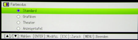 „Standard“, „Grafiken“, „Theater“ und „Anzeigetafel“ stehen als Voreinstellung zur Auswahl, wir werden im Bildteil untersuchen, wie sie die Bilddarstellung beeinflussen.