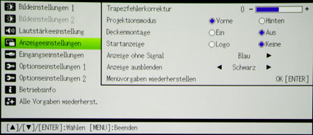 Wir überspringen die Rubrik „Lautstärkeeinstellungen“, da diese sich lediglich mit dem internen Audio-Lautsprecher beschäftigt und finden unter „Anzeigeneinstellungen“ einen Trapezausgleich, der bei einem Präsentationsbeamer nahezu unerlässlich ist. Auch Front-/Rück-/Decken/Tischprojektion kann hier programmiert werden, bei den anderen Parametern handelt es sich um rein kosmetische Einflussmöglichkeiten.