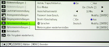 Im Menü „Optionseinstellungen1“ finden wir schließlich noch die wichtige Option „Eco-Modus“, mit der die Helligkeit und damit verbundenen Leistungsaufnahme und Lautstärke der Kühlung beeinflusst werden. Interessant ist die Tatsache, dass der Projektor hier nicht nur zwei Stufen bietet, wie nahezu jeder anderer Beamer am Markt, sondern gleich drei.