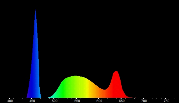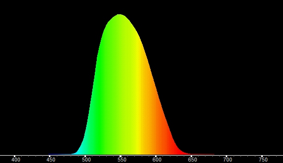 Bitte beachten Sie, dass obiges Bild je nach verwendetem Computer-Monitor stark von dem tatsächlichen Seheindruck abweichen kann (weil Ihr Monitor z.B. kein LED-Rot abbilden kann). Die Spektralmessung belegt unseren visuellen Eindruck. Großer Vorteil der LED ist es, dass sie sehr eine sehr schmalbandige Frequenzcharakteristik hat, nahe ihrer Sollfarbe.