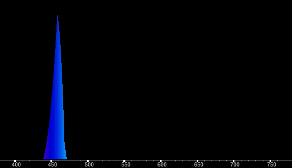 Erklären lässt sich dies mit der bekannten Eigenschaft von Lasern: Sie emittieren lediglich Licht einer einzigen Wellenlänge, sozusagen punktgenau bei der Wunschfarbe. Unsere Spektralmessung belegt dies: