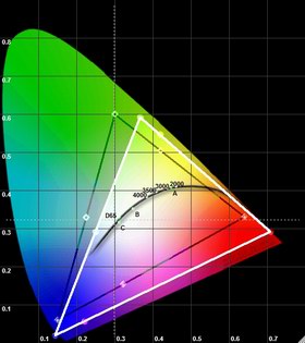 Das Farbsegel ist nicht weniger spektakulär: Für Rot und Blau reicht der Platz im Diagramm kaum aus, Grün hingegen bewegt sich im typischen Grün / Gelb Bereich. Für Anwendungen, die besonders reine und kräftige Farben benötigen, ist der Casio sicherlich ohne Konkurrenz, erstrecht in dieser Preisklasse. In Hinblick auf die herkömmliche Videonorm allerdings sind solche Abweichungen eher kontraproduktiv, da sie für übersättigte Farben sorgen und so Bildnatürlichkeit kosten. Darüber waren sich die Ingenieure offensichtlich auch im Klaren, denn in den Presets „Theater“ und „Graphics“ hat man versucht, den Farbraum in Richtung Videonorm zu kappen: