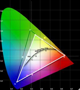 Nun ist es nicht so einfach, einen Projektor in Sachen Grundfarben zu trimmen, denn um den Farbraum zu verkleinern, muss man jeder Grundfarbe die anderen hinzumischen. Diese „gemischten“ Grundfarben muss man dann wiederum als Grundfarbe für die eigentliche Bildfarbmischung nutzen. Die (noch) exotischen Lichtquellen des Casio-Beamers erschweren dies zusätzlich, dementsprechend mäßig ist der Videonorm-Farbraum in dieser ersten Generation gelungen.