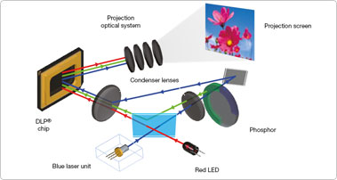Ein Tandem aus blauem Laser und roter LED erzeugt das Licht, für den Grünanteil sorgt ein spezielles phosphorbeschichtetes Farbrad, das das blaue Laserlicht in grüne Wellenlängen moduliert.