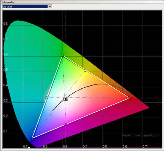 Es gehört zum Common Sense, dass jeder Projektor am Besten ab Werk perfekte Grausstufen haben sollte. Falls dies nicht der Fall ist, muss der Projektor durch Kalibrierung auf eine Farbtemperatur von 6500K abgestimmt werden. Etwas präziser geht es um die Abstimmung auf einen (Referenz-)Weißpunkt in der Nähe von 6500K, nämlich auf den so genannten D65 Weißpunkt. Die Graustufen dürfen angefangen von 0 IRE (= Video-Schwarz bzw. Dunkelgrau) bis 100 IRE (Maximalweiß) keinerlei Farbstiche, insbesondere nicht in Richtung ’Grün’, aufweisen, da das menschliche Auge bei Grün besonders empfindlich reagiert. Glücklicherweise ist das Bewusstsein bei Käufern digitaler Projektoren in den letzten Jahren stark gestiegen, so dass von guten Händlern in der Regel der Service einer Kalibrierung angeboten wird, wenn auch eine seriöse Graustufen-Kalibrierung einiges an Zeitaufwand erfordert. Das Mischungsverhältnis der Primärfarben R/G/B ergibt den D65-Weißpunkt, auch wenn es sich in der Praxis eher um eine ‘Weiß-Zone’ handelt. In Abbildung1 (CIE-Farb-Segel aller für das menschliche Auge wahrnehmbaren Farben) sieht man den Weiß-Punkt im Zentrum des Dreiecks. Möglichst viele verschiedene Level von Weiß (bzw. Grau) sollten möglichst nahe an diesem D65-Punkt sein. Als schwarzer Bogen von rechts unten (niedrige Farbtemperatur bei Rot) nach links unten (hohe Farbtemperatur bei Blau) ist die CCT-Kurve des idealen Körpers bei Erhitzung eingezeichnet. Wie man in Abbildung1 erkennen kann, entsteht bei der Messung der Weißpunkte unterschiedlicher Level eine Streuung (‘Gray Scatter’). Je kleiner der Bereich der Streuung und umso näher am tatsächlichen D65 Punkt, desto besser ist die Abstimmung der Graustufen.
