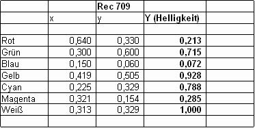 Der Weißpunkt D65 entsteht - wie beschrieben - durch korrekte Teilintensität der Primärfarben Rot, Grün und Blau, wobei die graphischen Darstellungen, die die Grausstufenmessung als gleich hohe Balken von R/G/B darstellen, irreführend sind, weil sie ein Mischverhältnisse aller drei Grundfarben von 100% suggerieren. Besser ist eine neutrale Darstellung des Weißpunktes als getroffenes Fadenkreuz, wie weiter unten in Abbildung7 zu sehen (die CIE-Target-Darstellung, die sich auch für eine Repräsention von DeltaE aller Farben und Graustufen einsetzen lässt). Die festgelegte Norm bezüglich des Referenz-Farbraums REC709 fordert eine Luminanz-Mischung für Referenz-Weiß aus exakt 21,3% Rot, 71,5% Grün sowie 7,2% Blau, was sich in Abbildung2 anhand eines gesetzten Referenz-Wertes für Weiß von 1,000 (= 100%) nachzuvollziehen lässt! Umgekehrt folgt (allerdings eben nur theoretisch!) aus der Helligkeit von Weiß die jeweils korrespondierende Helligkeit der isolierten Primär- und Sekundärfarben. In der Praxis stellt man allerdings fest, dass erhebliche Abweichungen von den theoretisch zu erwarteten Werten gemessen werden, sogar wenn die Graustufen gut stimmen! Die Erklärung dafür, warum die theoretischen Werte in der Praxis verfehlt werden, ist vielschichtig, aber nicht überraschend: um in der Praxis nach der Theorie perfekte Werte zu erreichen, müssten alle beteiligten elektronischen Komponenten (Farb-Dekoder, Eingangsstufen etc.) und alle optischen Elemente (Farb-Panels, Polarisationsfilter) absolut linear arbeiten, was in der Praxis erfahrungsgemäß nur näherungsweise der Fall ist bzw. eben gerade weniger gute von sehr guten Projektoren unterscheidet. Abbildung3 zeigt ein konkretes Messprotokoll für einen relativ gut eingestellten Projektor. Die Abweichungen sind in Prozent vom Sollwert angegeben. In der Praxis wurden Projektoren gemessen, die Abweichungen von bis zu 40% zum Soll in der Luminanz aufwiesen, obwohl das ‘Farbdreieck’ nahezu perfekt war. Umgekehrt kann auch der Fall auftreten, dass das Farbdreieck zwar weniger perfekt aussieht, allerdings die Luminanzen näherungsweise korrekt sind, wodurch Projektoren mit ‘erweitertem’ oder ‘schiefem’ Farbdreieck überlegen sein können! Warum dies so sein kann, lässt sich an der Messtabelle in Abbildung 4 nachvollziehen. Luminanzfehler und ‘Farbdreieck’-Fehler bilden Komponenten eines Gesamtfehlers.