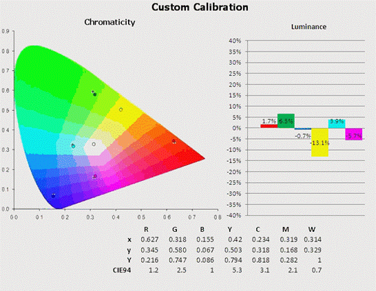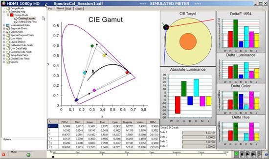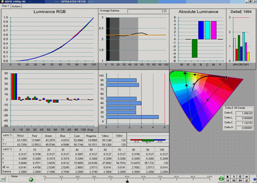 Besonders nützlich und umfassend auch und gerade im Zusammenhang mit der Messung der Luminanz aller Primär- und Sekundärfarben ist die Software CalMAN Professional der Firma SectraCal. In Abbildung7 ist zu sehen, wie die unterschiedlichen Aspekte zur Qualitätssicherung der Farbreproduktion in Messdiagrammen dargestellt werden. Ziel ist es, bei die DeltaE-Werte (hier nach CIE1994) möglichst für alle Farben unter einen Wert von 3 zu bekommen. Ab einem Wert von 3 und geringer gelten die Farben als so gut, dass Differenzen per menschlichem Auge nicht mehr wahrgenommen werden. In Abbildung7 sieht man sehr anschaulich, wie sich das resultierende DeltaE aus unterschiedlichen Komponenten (Delta xy im CIE Gamut graphisch repräsentiert) sowie DeltaHue und Delta-Luminanz etc. zusammensetzt.