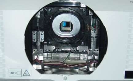 Hinter dem Objektiv wird ein Blick auf die Lightengine mit dem Glasprisma frei, das die drei Einzelbilder der RGB-LCDs zu einem gemeinsamen echten Farbbild vereint.