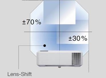 Mit ihm lässt sich das Bild +/-60% der projizierten Bildhöhe vertikal und +/-30% der Bildbreite optisch verschieben, ohne dass Einbußen in Auflösung und Schärfe in Kauf genommen werden sollen.