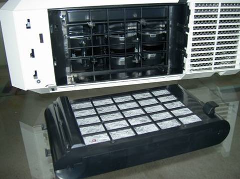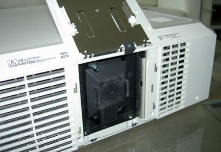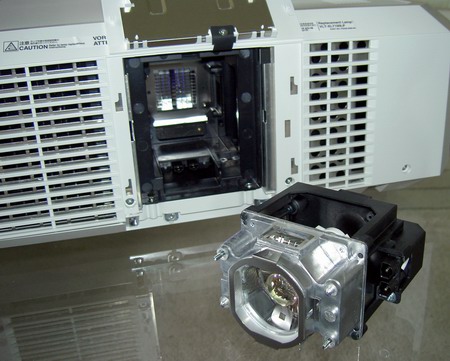 Auch die 350W starke UHP-Lampe bietet eine angenehm lange Lebensdauer von bis zu 4000Std (Eco Modus) und kann im Bedarfsfall sehr leicht auf der rechten Seite des Chassis getauscht werden.