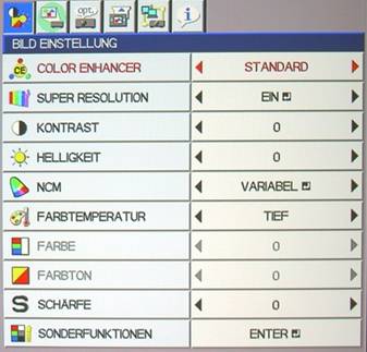Die wichtigste Kategorie ist zweifelsohne das Bildmenü: Hier finden sich in erster Linie grundlegende Bildparameter wie Helligkeit, Kontrast, Sättigung etc.. Besonders erwähnenswert und wahrscheinlich noch nicht jedermann bekannt ist die „Super Resolution“: Hierbei handelt es sich um einen besonderen, pixelbasierenden Algorithmus, der die Detailschärfe anhebt, ohne störende Artefakte zu provozieren (mehr dazu im Bildteil dieses Tests).