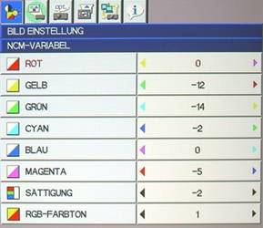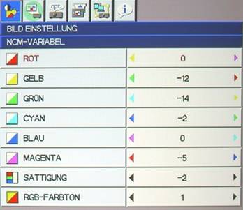 Wie bereits im ersten Kapitel aufgezeigt, bietet der UL7400 im Bildmenü ein eigenes Color Management, mit dem die Primär- du Sekundärfarben nachträglich verändert werden können. Getrennt beeinflussbar ist aber ausschließlich der jeweilige Farbton (Hue), die Sättigung kann nur für alle gemeinsam eingestellt werden.
