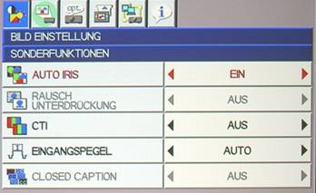 In der Unterrubrik „Sonderfunktionen“ befinden sich weiterführende Bildoptionen wie die kontraststeigernde adaptive Lichtblende, sowie Bildverbesserer und Schwarzpegeljustage.