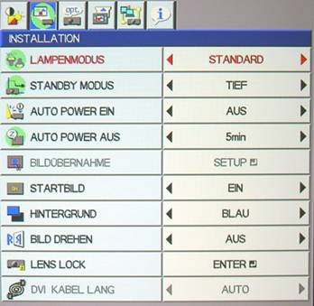 Die zweite Rubrik „Installation“ bietet primäre Integrationsfunktionen, die meisten davon selbsterklärend. Erwähnenswert sind hierbei der regulierbare Lampenmodus und der „Lens Lock“, mit dem ein unbeabsichtigtes Verstellen der Optik durch die Fernbedienung verhindert werden kann.