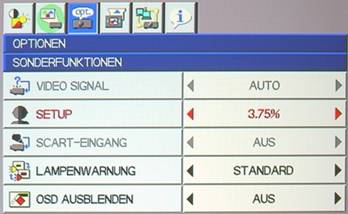 Anscheinend wollte man keinerlei Risiko eingehen und hat auch beim neuen UL7400U die herkömmliche Menüstruktur beibehalten, wie sie seit vielen Jahren in nahezu allen Mitsubishi-Projektoren zum Einsatz kommt. In fünf Hauptkategorien, horizontal durch Symbole gekennzeichnet und nach Themen sortiert, befinden sich alle Einstelloptionen.