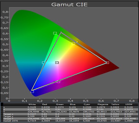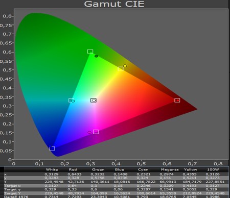 Unsere Messung nach einer Kalibrierung zeigt, dass man den Farbraum mittels dieses Color Managements näher an die Norm bringen kann. Die Sättigung von Grün lässt sich etwas reduzieren, lediglich die leichte Gelbtendenz bleibt unverändert.